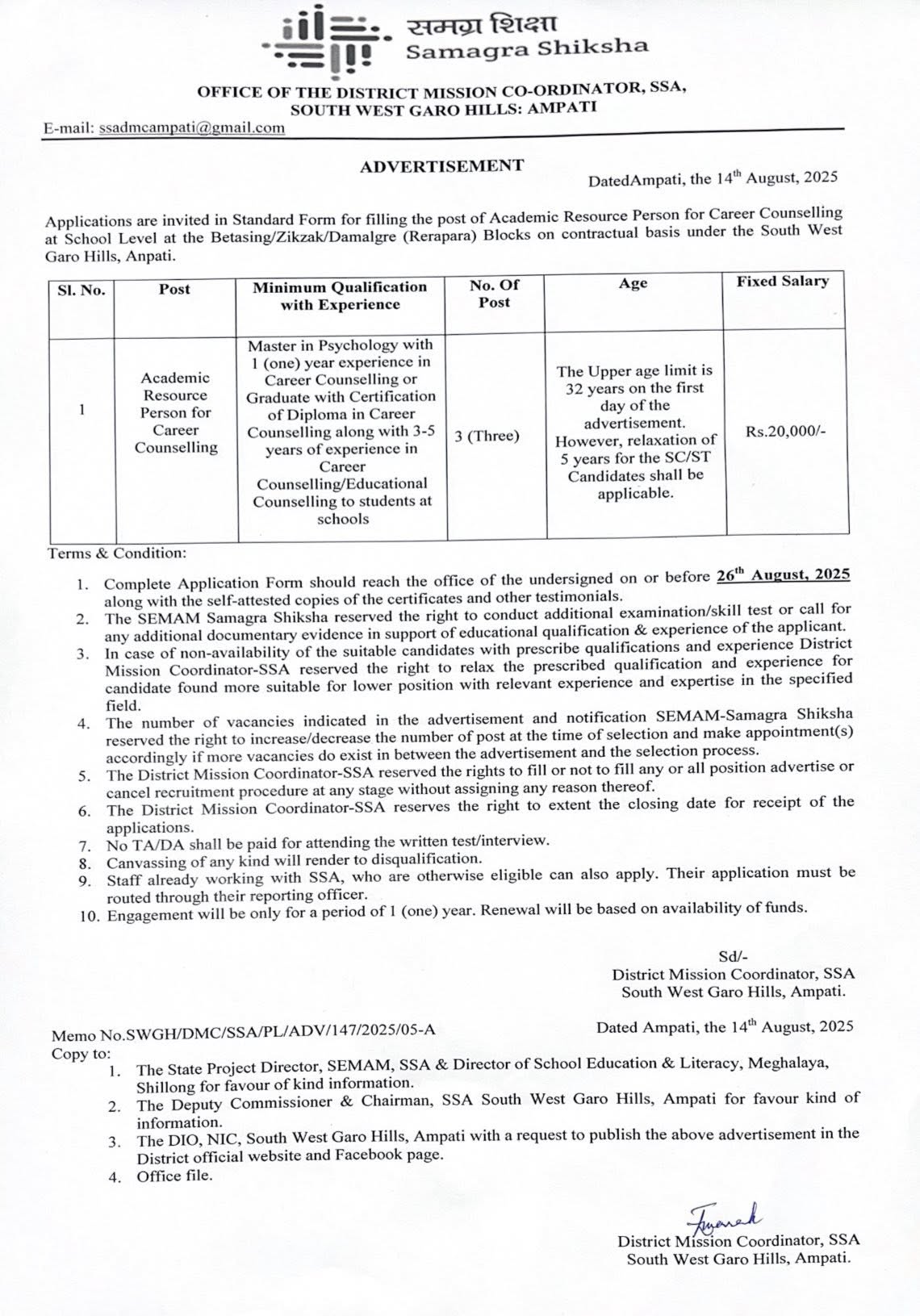 The completed application form, along with self-attested copies of certificates and other documents, must reach the office of the District Mission Coordinator, SSA South West Garo Hills, Ampati, on or before 26th August, 2025.